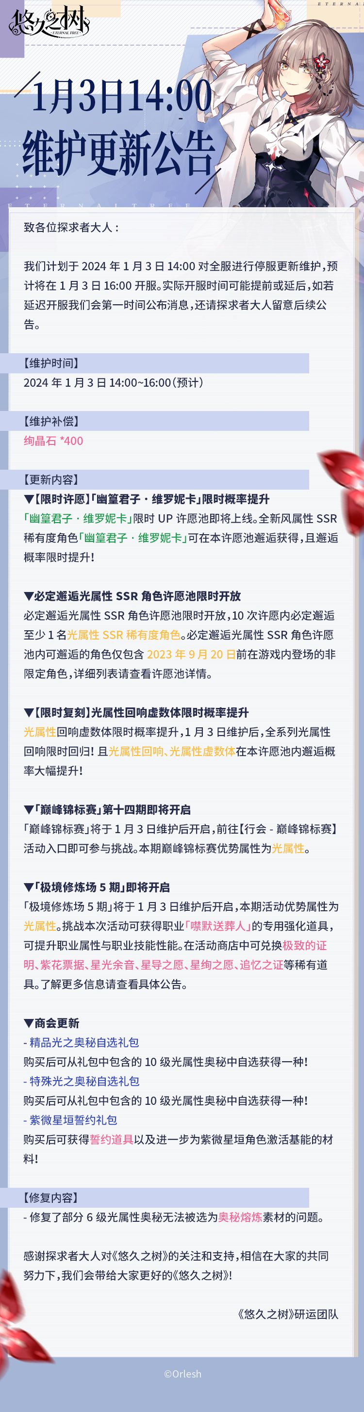 我们计划于2024年1月3日14:00对全服进行停服更新维护,预计将在1月3日16:00开服。实际开服时间可能提前或延后,如若延迟开服我们会第一时间公布消息,还请探求者大人留意后续公告。