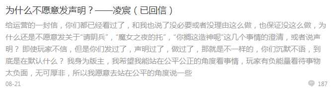 周年庆版本,我在8月21日的发了三封信,确实也是因为我已经出离的愤怒,我是不愿意和官方起冲突的,因为很多时候我算是沟通的一个桥梁,如果桥梁断了,以后大家有什么想法,有什么地方能及时反馈?请原谅我那天的任性,对不起。