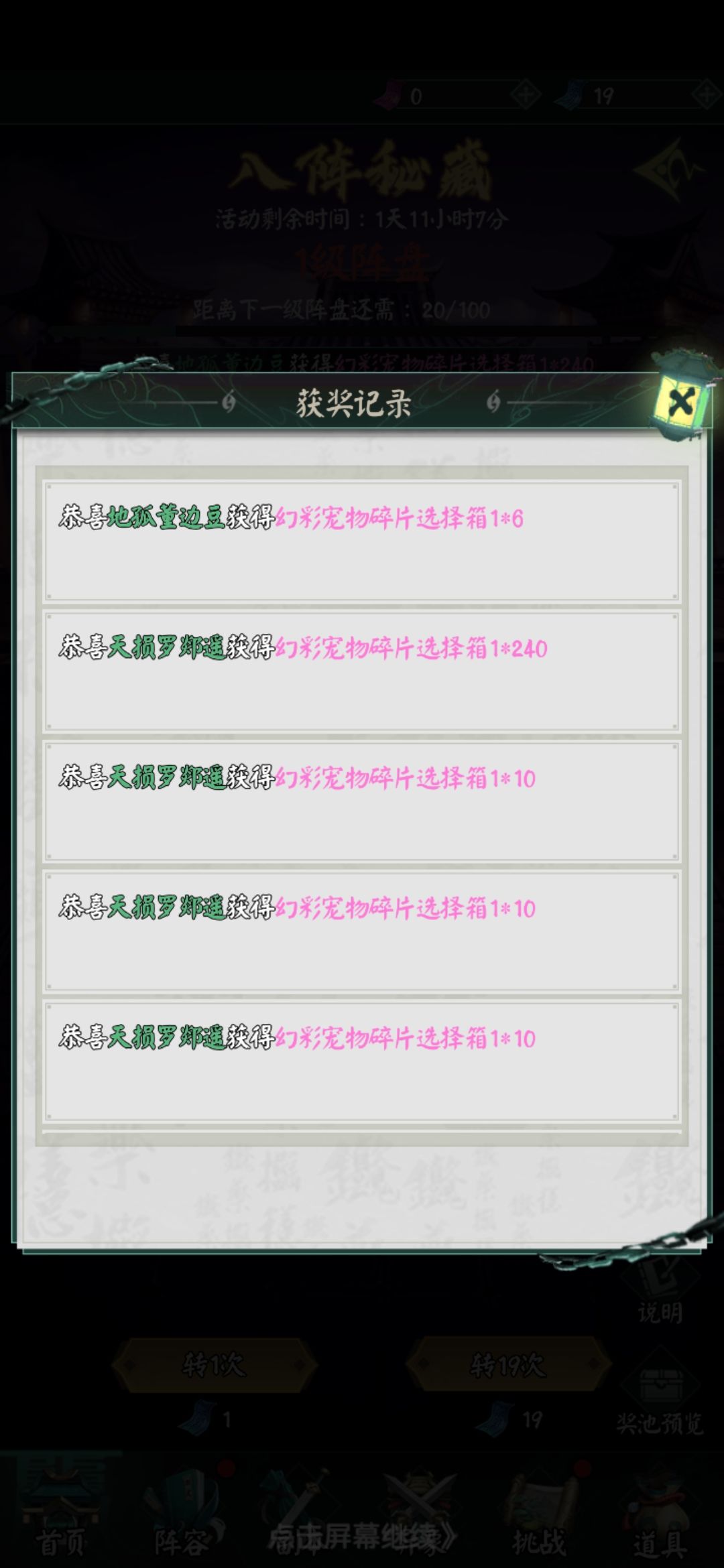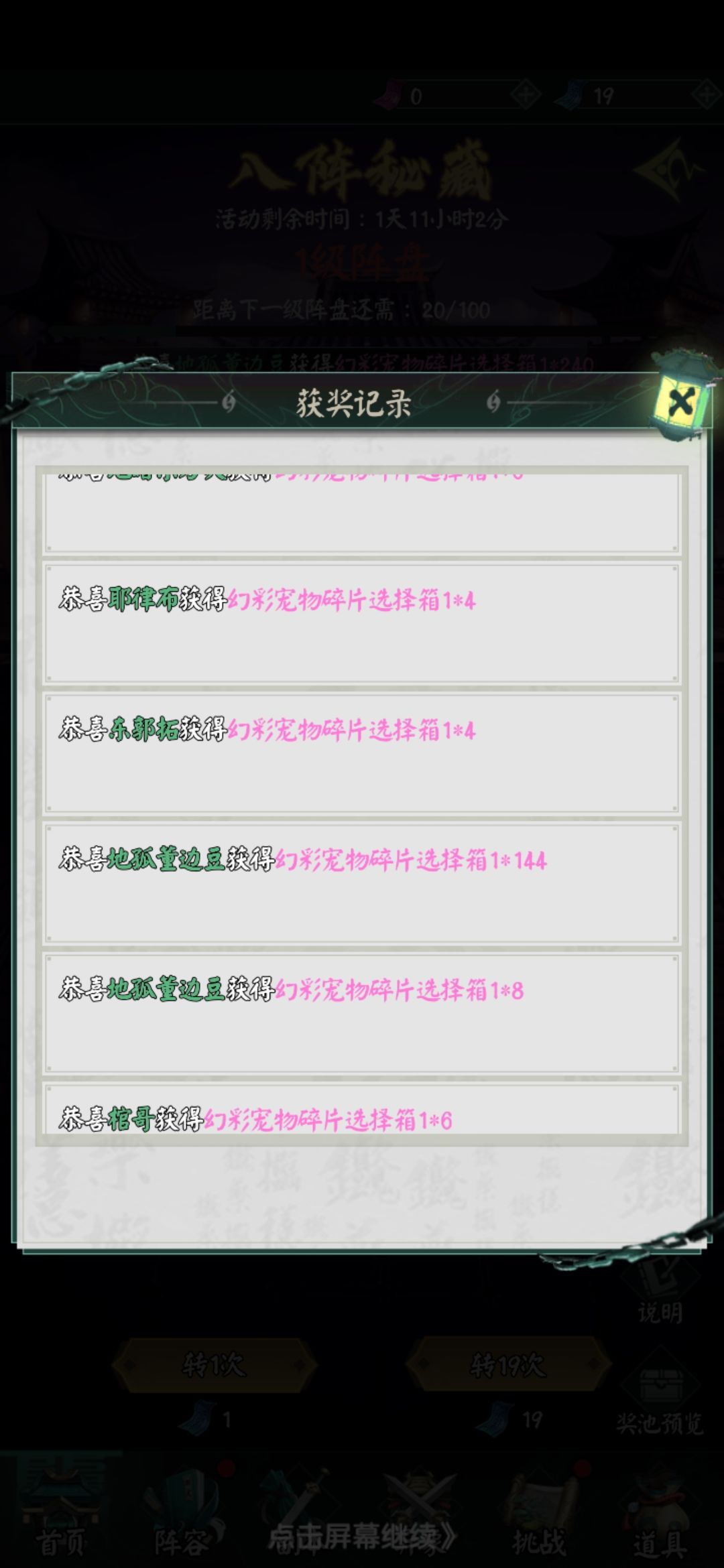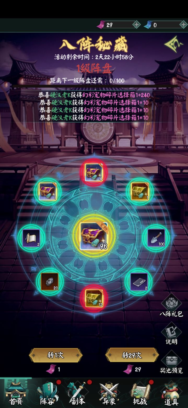 1.平民:活动三天,一天上限可获得20张普通券,可以适度囤一点体力,因为楼主刷了三天感觉这获得概率波动非常大,有时50体力能刷到3张,有时刷了150体力才1张。为了预防脸黑,平民可以平时适度囤一些些体力,没必要囤太多,毕竟上限就20。至于小氪,没必要氪这个,后面讲氪佬时会提为什么。然后有了券就是使用时机了,看区里的转盘等级,逮到不是0级时都可以出手,因为氪佬一般直接氪到出大奖的,否则是大亏的,所以有等级的话,氪佬一般会快速清零它,在那之前你可以有机会多蹭几个紫金3,楼主做实验试过扔在5级让平民截胡,但放置时间不长,只被截走了一些紫金3。可能对氪佬还是有保护机制的。但也有人砸了648以后发现坑太深就放弃的,丢了好久平民拿走了大奖。就像下图,这种欧皇还是有的。