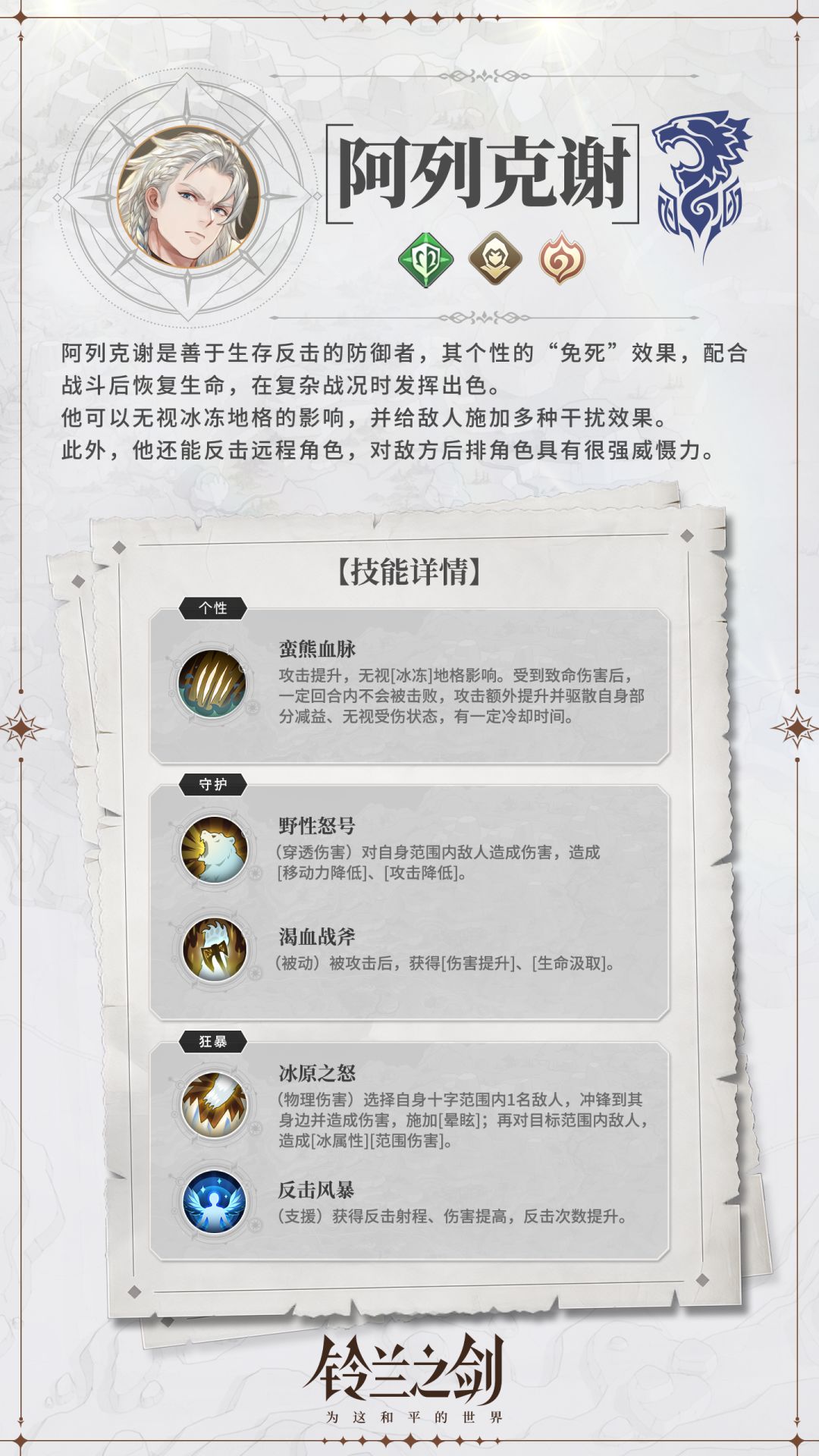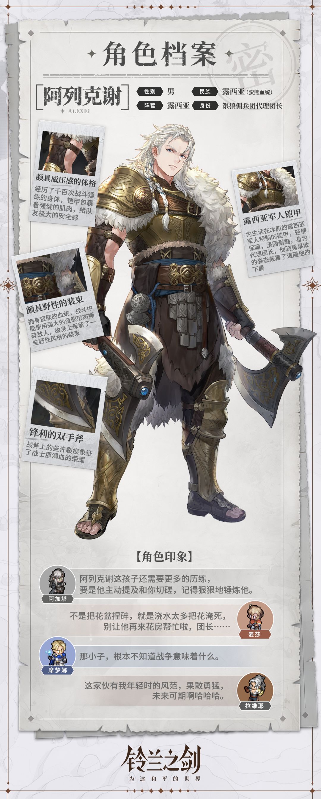 阿列克谢是银狼佣兵团代理团长,也是集热血与天资于一身的蛮熊战士。在他俊朗英武有压迫力的外表下,其实是个腼腆的大男孩。