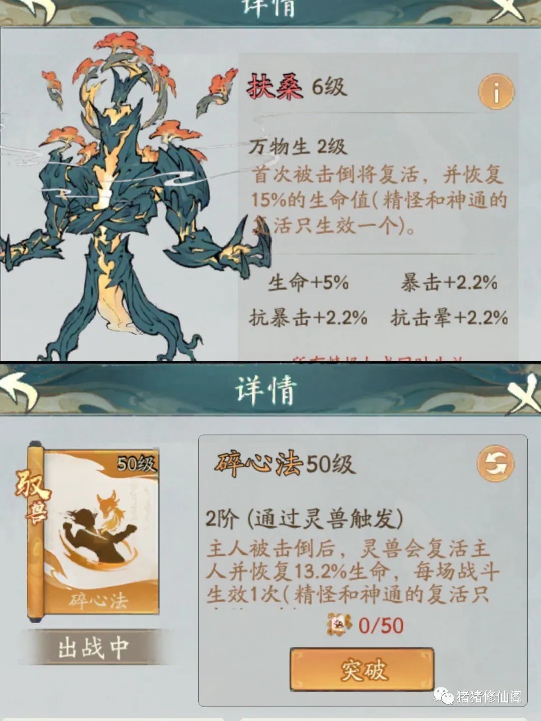 ①:碎心法是神通技能通过灵兽触发,而扶桑是精怪技能通过人物触发;