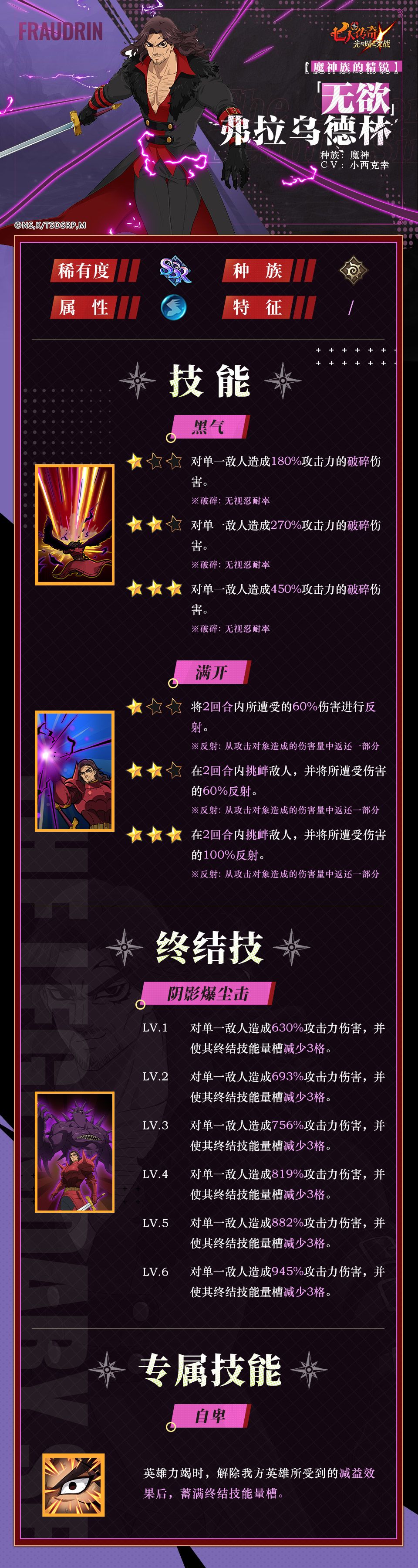 ☛【魔神族的精锐】「无欲」弗拉乌德林能挑衅敌人并反射部分所受伤害于发动攻击的敌方英雄。而在自身力竭时,还可解除我方全体英雄受到的减益效果,并蓄满其终结技能量,以协助队友完成绝地反击。