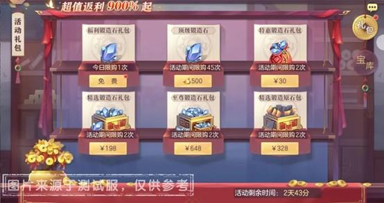 至尊锻造石礼包:含顶级锻造石*45,元宝*6480,售价648元,活动期间限购2次