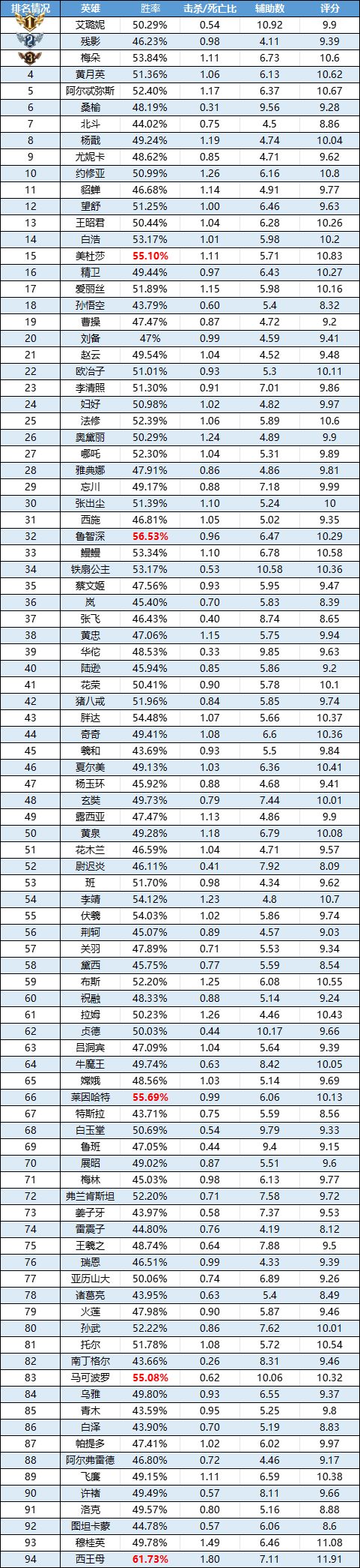 排序:榜单按出场率由高到低排序,标红为当前数列前5。