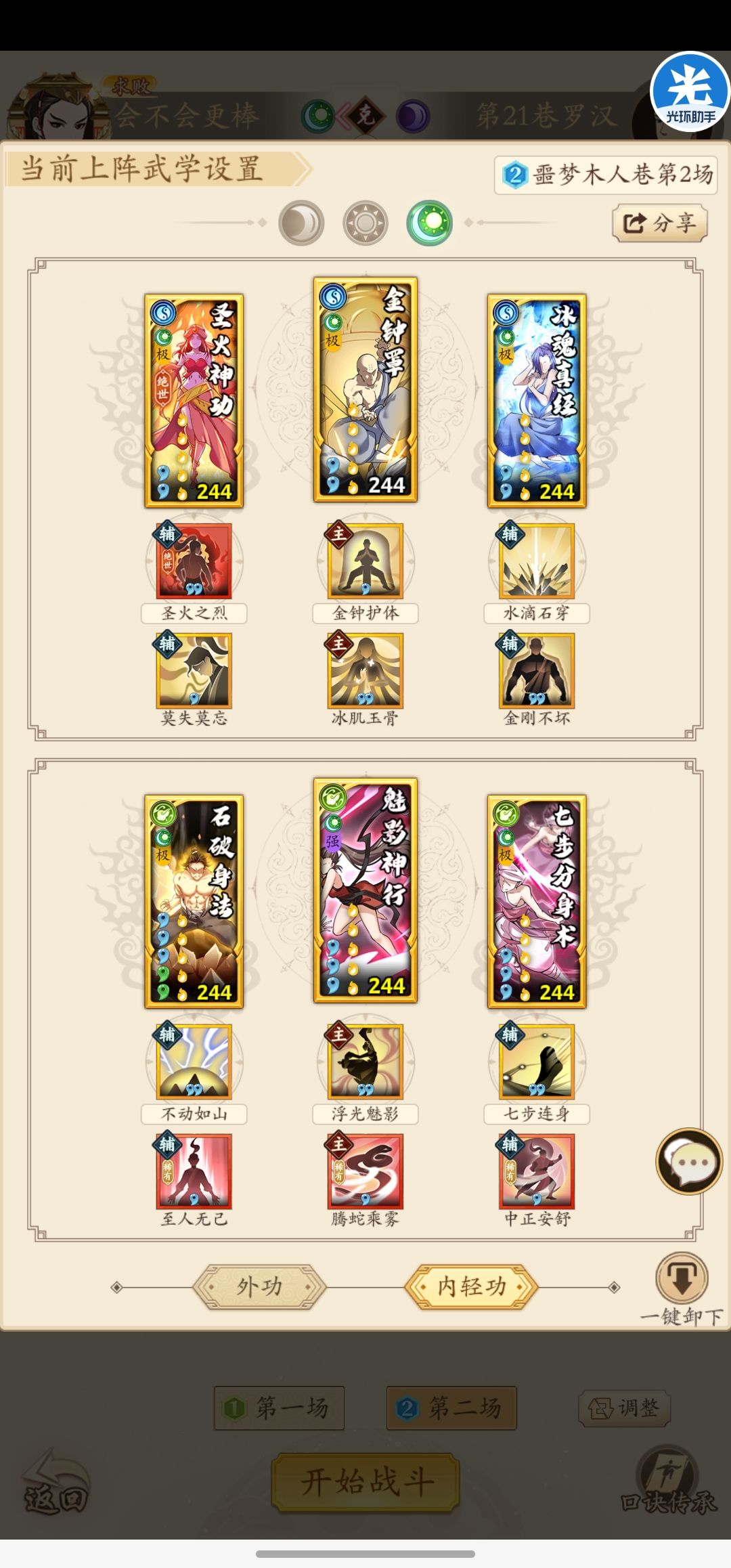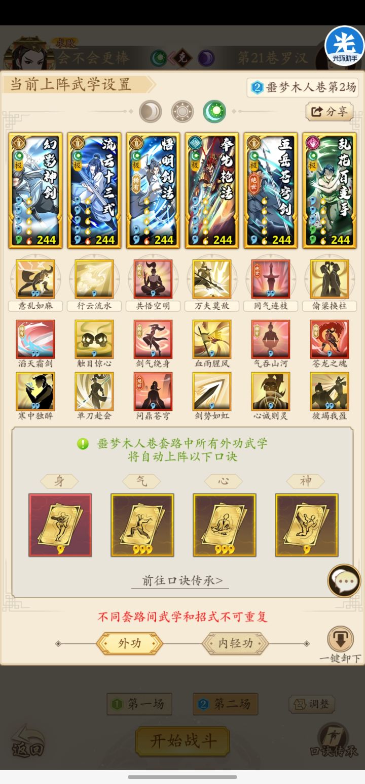 这两套都没什么好说的,噩梦20层第一关和第二关都是多出手多后手,而且回血嘎嘎猛,所以低战不要妄想通过叠dot的方式硬闯。第一套吸内拳,挂飞龙和沙鹰打麻痹和盲目,用回阳来维持续航。第二套奉先枪法加五岳是核心,乱花手可以给自己挂很多增益,有时候甚至可以偷到饮血警惕之类的高收益增益。第一套吸内53w战力,第二套五湖四海调和52w战力,对练度要求不是很高,推荐小氪玩家和白嫖玩家使用。