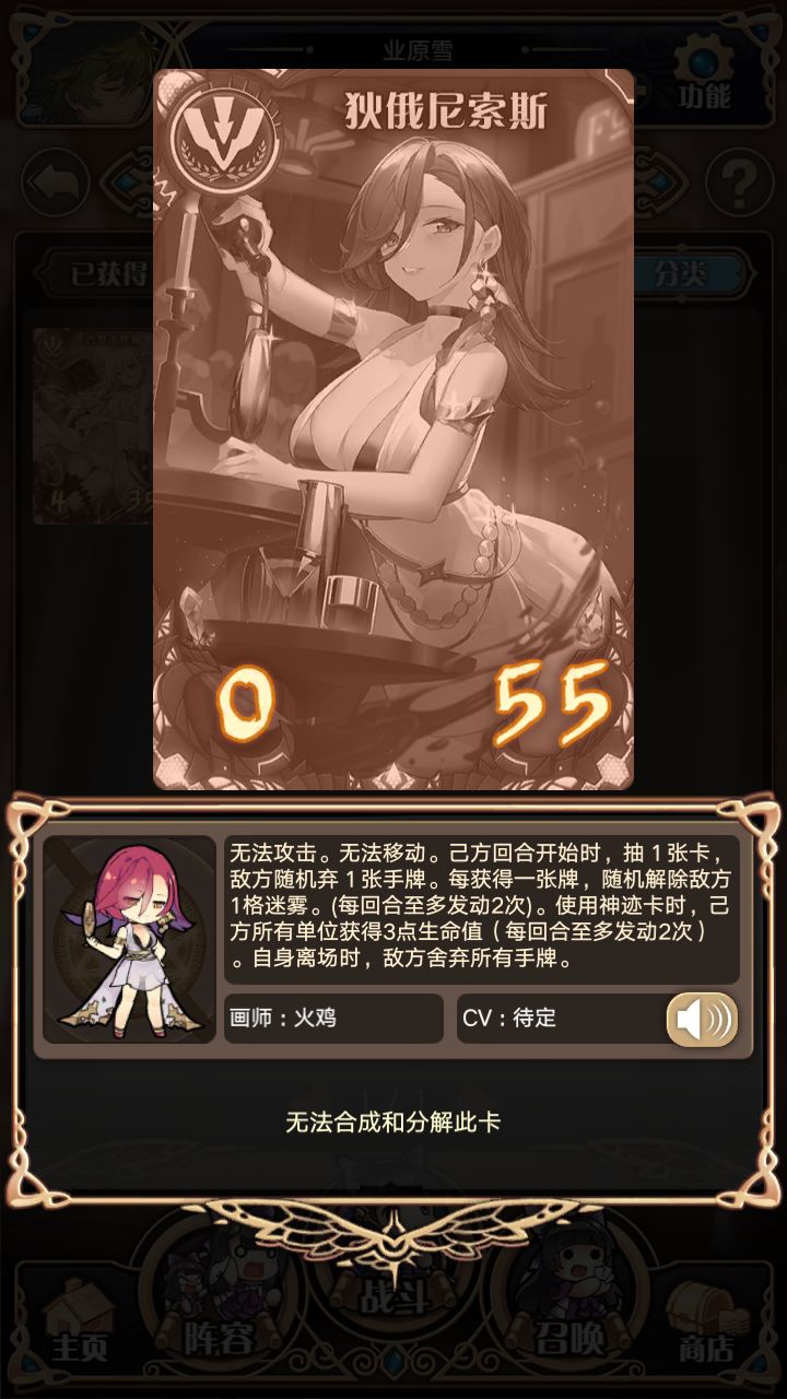 (截图是在小号上截的,今年才开的号所以没有)面板0/55。无法移动无法攻击。可以装填显得没有什么用处,但是这里就涉及到一些高分段玩家的小细节:类似龙首这种全体受益的秘术牌你可以给酒神装着,从而给主神腾出秘术位装上王土这种单体受益的秘术。在一些具备功能性且偏向于防守的弹幕也可以扔给酒神,所以柱子也有柱子的妙用。技能方面略显鸡肋,但毫无疑问比较万金油:抽一张牌弃对面一张牌,这个技能组合其实比较有争议,如果是通过每轮抽1打1提速,那么弃一张牌的效果约等于没有,但是如果是组在慢速里,弃一张牌有奇效,(我打别人的酒神整天把我最重要的几张牌全弃了。。。)但是抽一张牌带来的后果却是更早进入疲劳。每获得1张牌开1格雾,每回合限两次。自身离场时弃掉对面所有手牌。这2个技能算是一个提速手段,给偏苟的构筑一些提速能力。每使用一次神迹牌,己方全体回复三点生命,每回合限两次。咋一看没啥卵用甚至不如弗丽嘉,但实际上这个就是酒神的核心点所在。整套酒神卡组的韧性就是在这个技能体现的。在封刃与被封刃的拉扯中,通过这个技能你可以慢慢把血线抬起来。单奶量比肯定不如别人,但整个技能搭配起来酒神的会莫名合理。弗丽嘉虽然奶量相当但是另一个技能发挥实在困难所以一般只作为一个抬血线的副神使用(特定卡组除外)相比之下肯定是酒神会好用些。推荐卡组:狮子加质量单卡或者辅助。狮子拖家带口的能力可不是吹的。并不局限于坚壁或者加攻击,针对卡组大师绫小路月做了一套酒神大象狮。大象慢慢磨也有不错的表现。宙2猿王。猿王作为一个很强力的单卡和万金油的配合是不用愁的。这套由t1旅者dd给出,借鉴了以前妙手的思路,用一堆秘术加大对手的操作难度,酒神每回合抽1张牌的技能得到充分发挥。宙3尼约德。这套是我自创的。。。宙3的低成本成长老实说很强,但就是疲于开雾和生存,恰巧酒神站了开雾和生存,尼约德站了开雾(衍生物a)成长和生存。使得这套的韧性出奇的好,3回合对面不能结束战斗的话自己就赢一半。总结:四个字:中规中矩。万金油使得泛用性出奇的高,但神代是一个特化性很强的游戏。这种中规中矩的副神反而没有什么很好的出路。前面给出的卡组都是需要一定技术才能玩的,毕竟这副神不是勇者都不敢拿来上分。