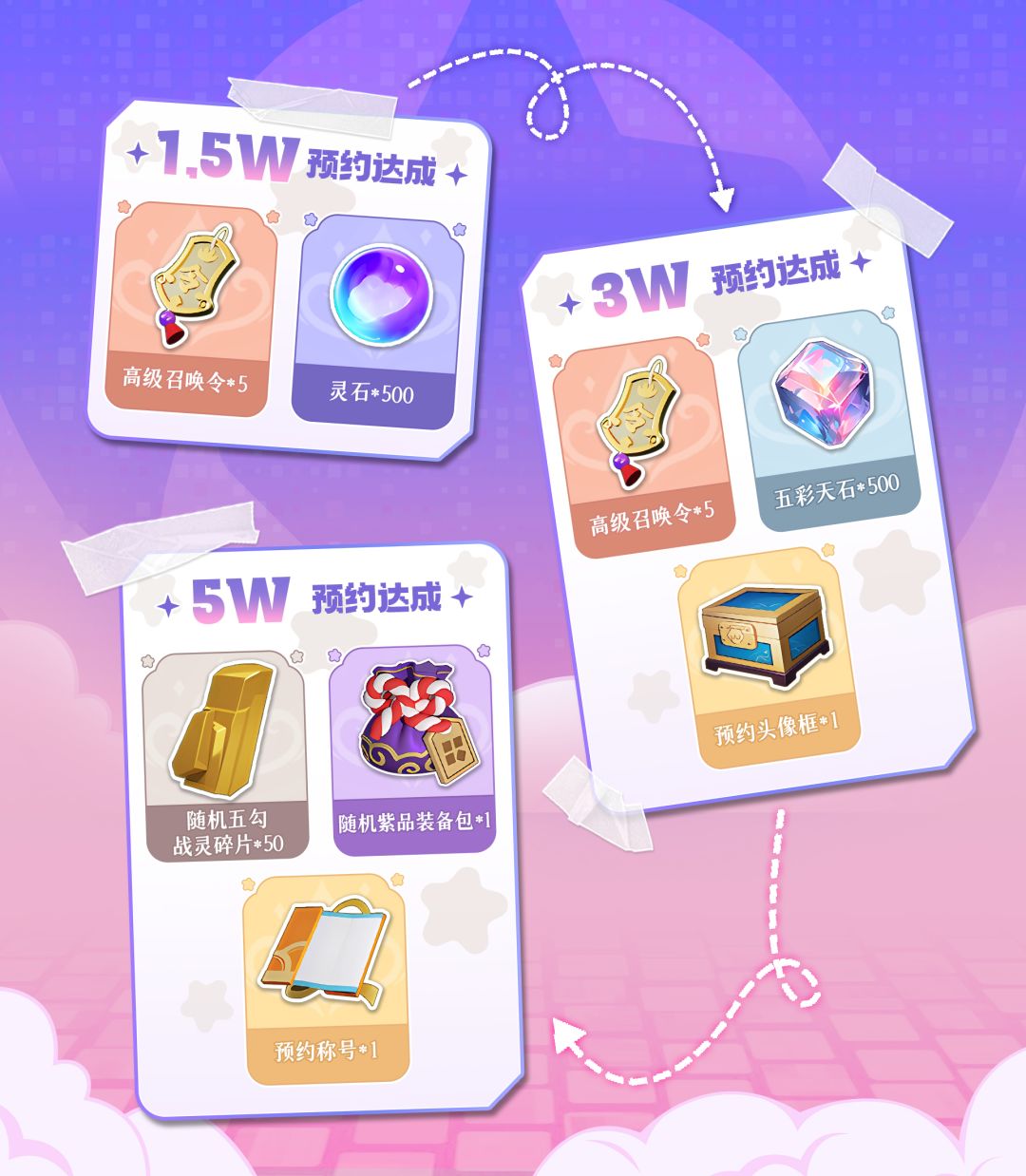 当参与预约的唤灵师大人达到数量后将会在公测时发放预约里程碑奖励,最高将一次性发放五彩天石*500+灵石*500+高级召唤令*10+随机金色战灵+随机紫色装备+预约称号+预约头像框的奖励!
