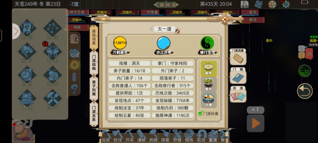 七.给大哥造偷天七绝针,提早造上下左右四个大凶房收集精粹。大哥养成之后,邀请门派大能过来(优先打丹霞洞天拿凤阵),并杀死门派大能,可以降低门派实力,大概要邀八,九个(记得一次性邀,不然好感低了进不去)。