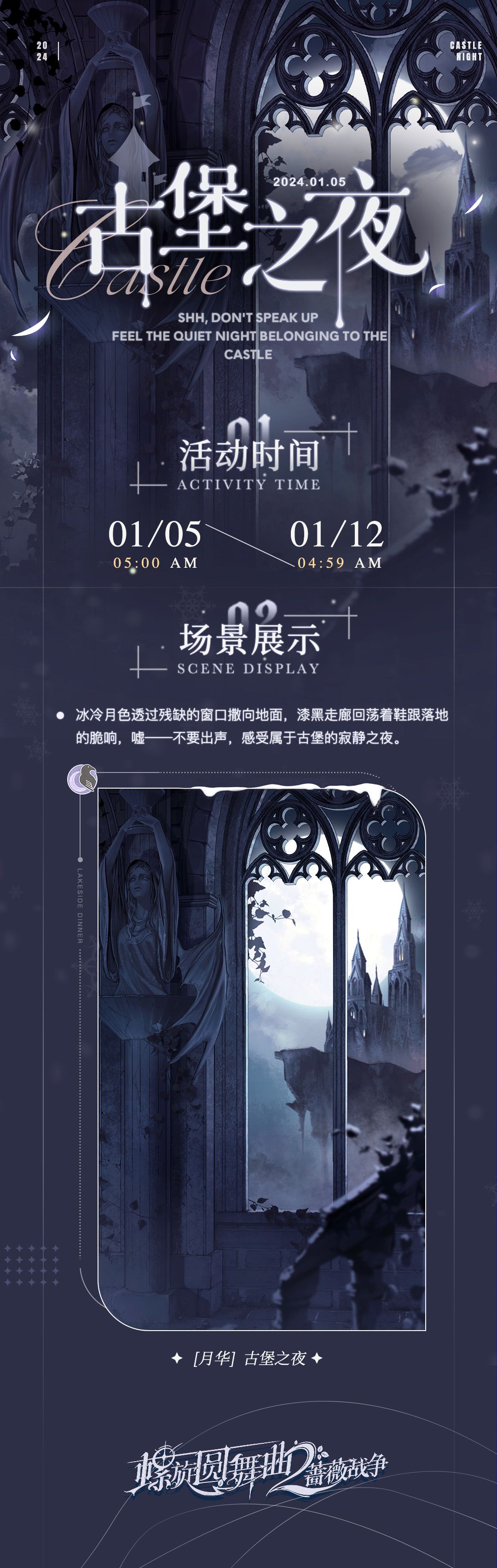 1月5日5:00-1月12日4:59,累计登录达指定天数,即可免费领取限定贴纸、花叶券等幽夜赠礼;购买【幽夜定制】还可额外领取限定月华品质场景「古堡之夜」、限定贴纸、钻石等丰厚奖励。
