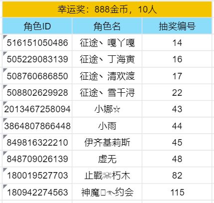 本次开奖因部分楼层所留言的角色ID数量过多,无法根据楼层抽奖。为此换成临时编号对其角色进行抽奖。