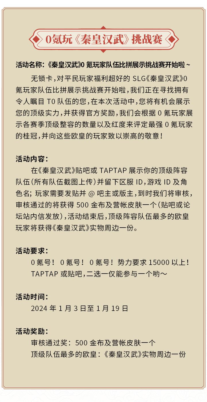 号外!0氪玩《秦皇汉武》挑战赛开启