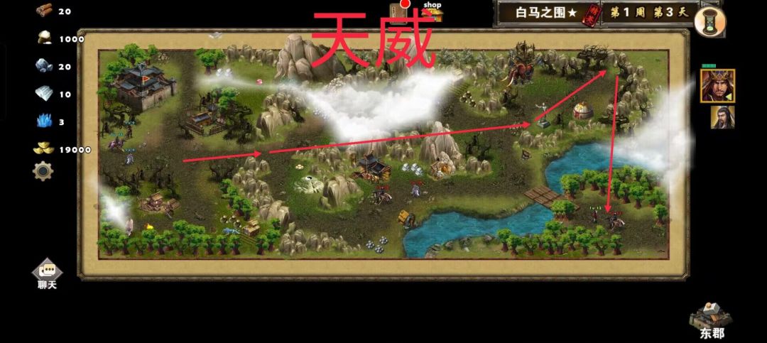 打法思路:调好站位以后先把门口的武将解决掉然后往下走(上面走敌方武将堵口了需要战斗)隔天吃掉雕像属性直接攻打寨子,战斗开始以后司马懿先秒掉一组投弹手然后用兵书打城门利用九天惊雷仗的被动清掉第二组投弹手,这个时候计算好伤害最好是可以直接秒掉城门然后司马懿在一个一个秒小兵。解决完寨子以后往下走解决最终武将即可通关。