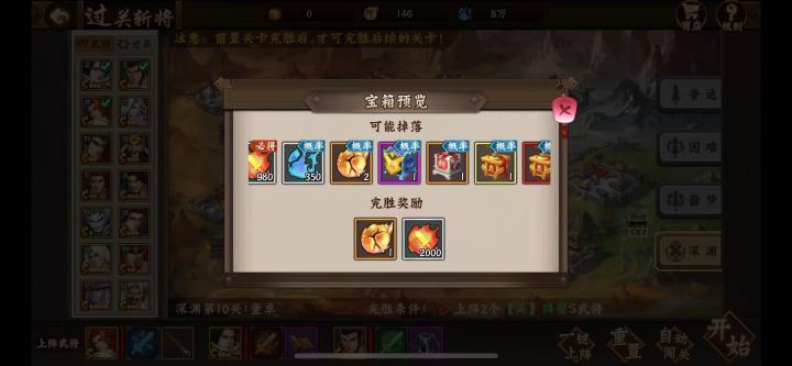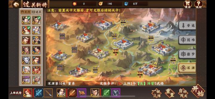 1、排兵布阵很重要,过关斩将难度由易到难。因此我个人排兵布阵也是先把评分不是很高但拥有远程技能的武将排在前面(远程技能在过关斩将里有很大优势)