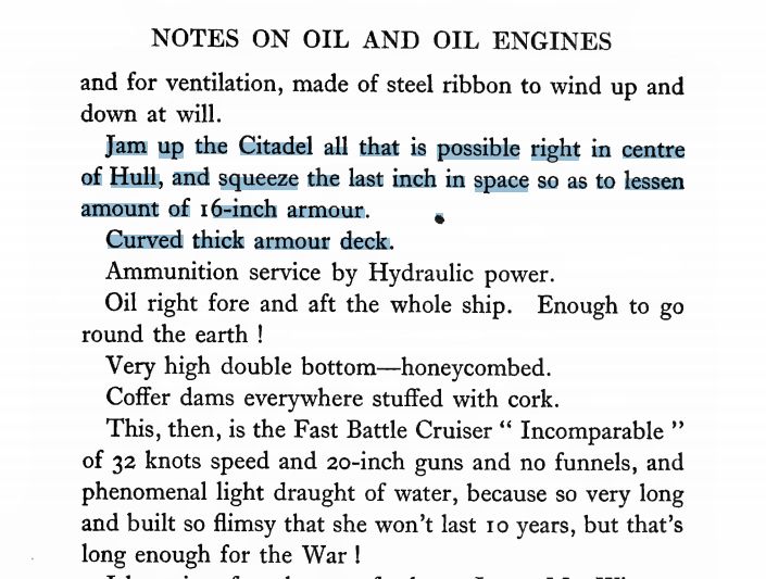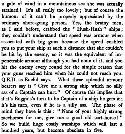 ——“...they couldn't understand that speed was armour when associated with big guns because the speed enabled you to put your ship at such a distance that she couldn't be hit by the enemy, so it was the equivalent of impenetrable armour although you had none of it, and you hit the enemy every round for the simple reason that your guns reached him when his could not reach you...”