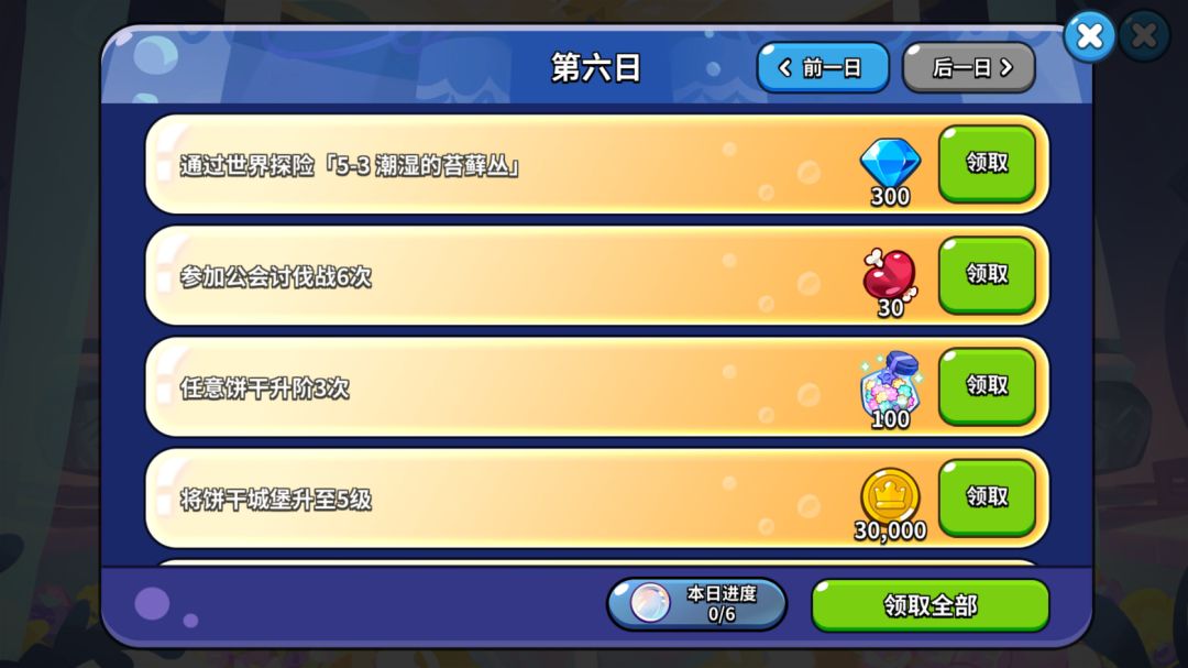 第六日的玉从露芥子莲大家别忘记做,不过第六天没有什么特别需要当天抓紧做的,只要之前的时间每天都推图,刷公会讨伐战副本,这一天的任务奖励甚至可以直接全部领取。
