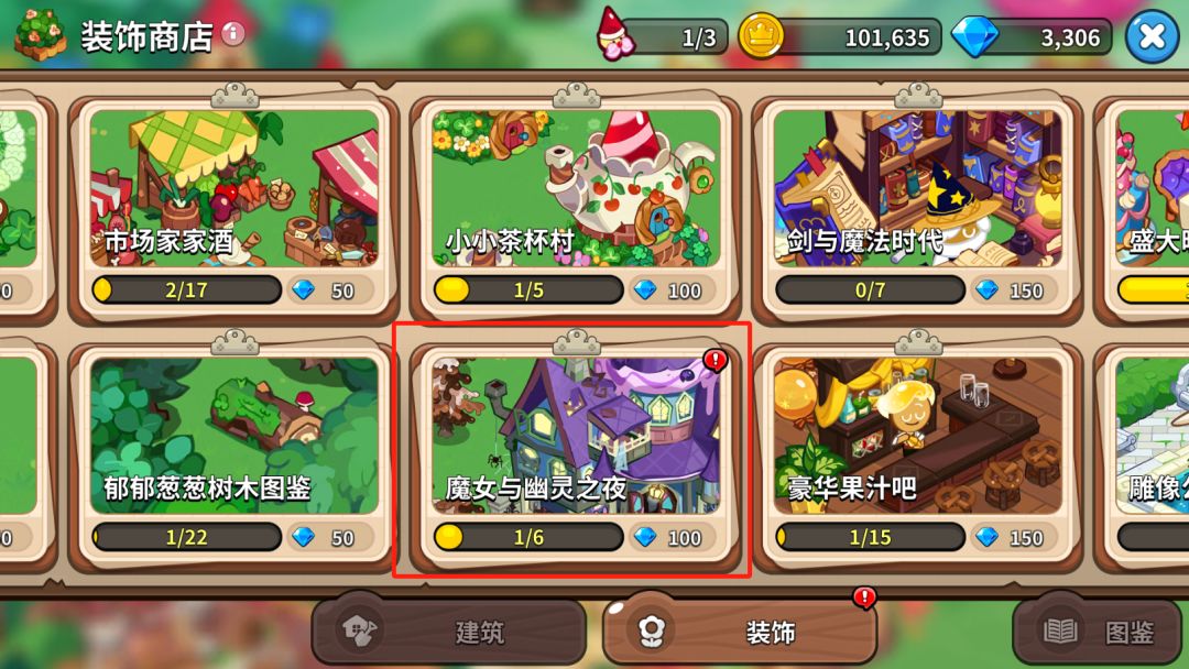 右侧的领地先开辟两个有东西的地方。当天可以解锁一个叫做魔女之屋的建筑,同时解锁“魔女与幽灵之野”这个系列的装饰。建造党是比较开心的。