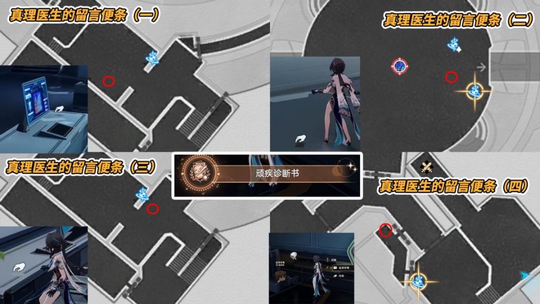 分别前往图中标注的4个点位,拾取‘真理医生的留言便条(一)、(二)、(三)、(四)’,全拾取后将触发成就「顽疾诊断书」。