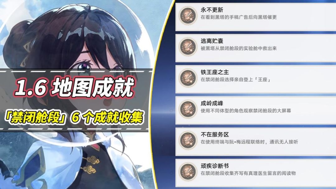 以上6个即为目前「禁闭舱段」可触发的相关地图成就,属于《与你同行的回忆》一栏,共30星琼。由于总耗时较少,已经做完开拓续闻「庸与神的冠冕」的开拓者可以随便逛逛,可轻松全收集~