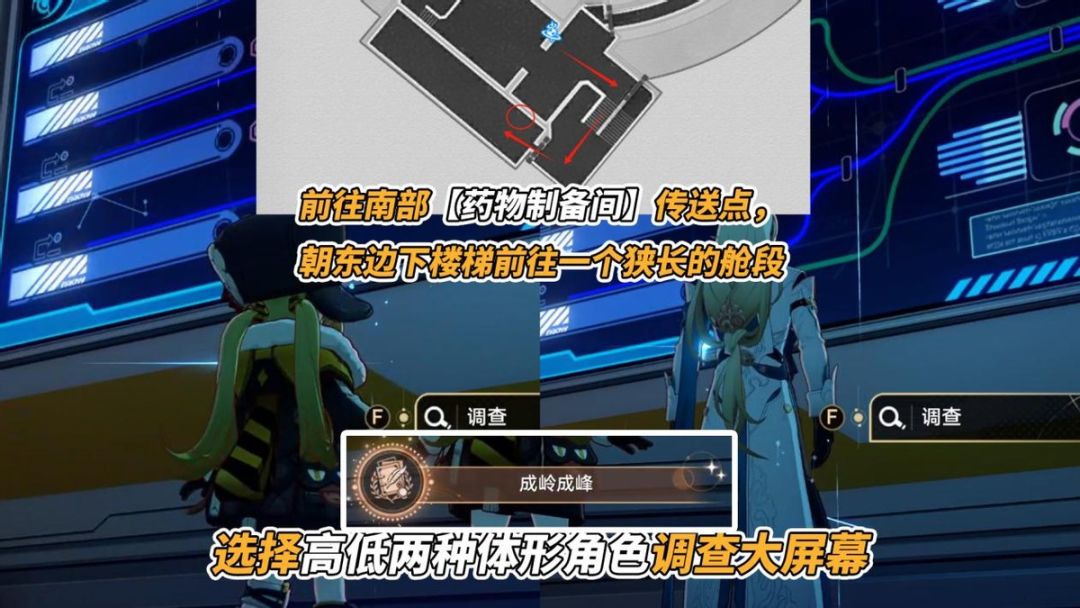 前往南部【药物制备间】传送点,朝东边下楼梯前往一个狭长的舱段,选择高低两种体形角色(例如丹恒、虎克)调查墙上的大屏幕,即可触发成就「成岭成峰」。