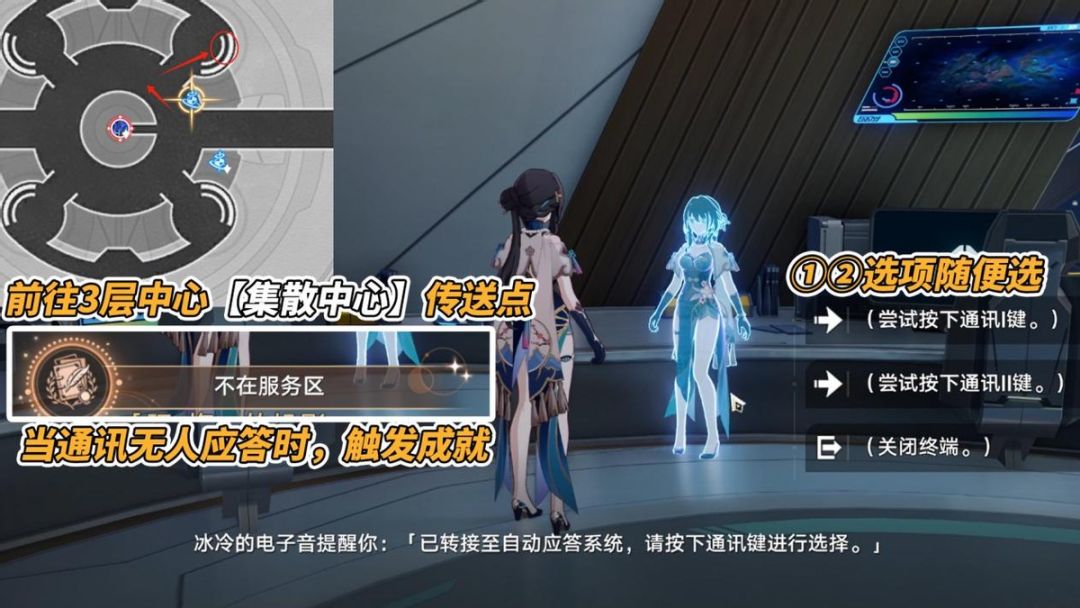 前往3层中心【集散中心】传送点,与旁边工作台的终端交互,内置了阮梅的联系方式,选择‘向阮梅发起通话邀请’,而后出现2个选项,随意选择通讯Ⅰ或Ⅱ,都有概率接通阮梅的通讯,你可以问她一些东西。也有概率无人应答,此时触发成就「不在服务区」。未成功触发的不妨多试试,别急~