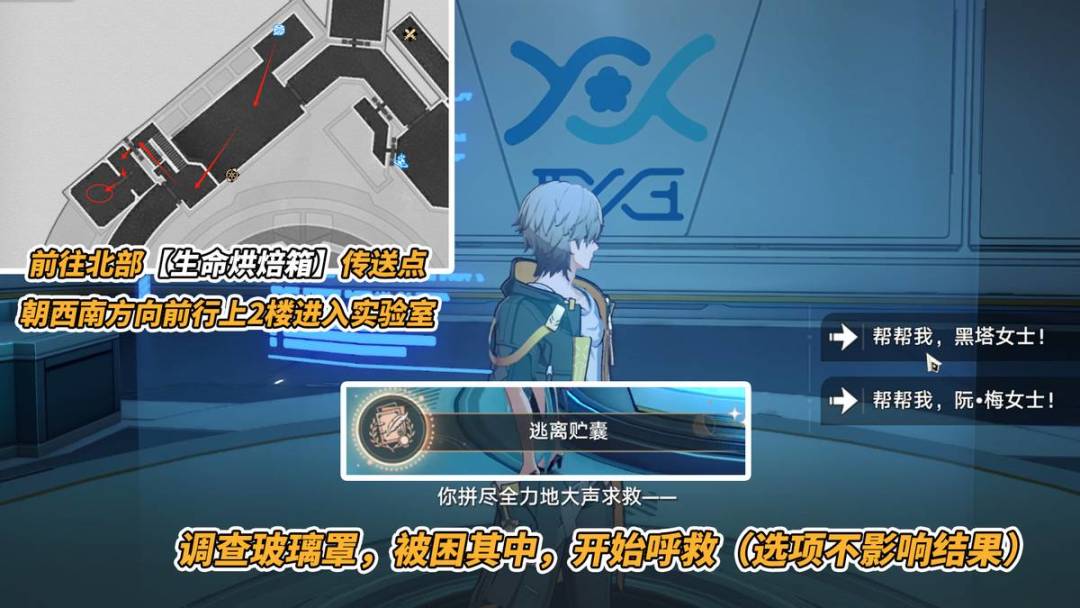 与实验室中心的玻璃舱交互,意外掉入其中被关住,伴随一阵气体抽离即将昏迷,你的选择是?帮帮我,黑塔/阮梅。选哪个不影响结果,与前来救你的黑塔对话,触发成就「逃离贮囊」。