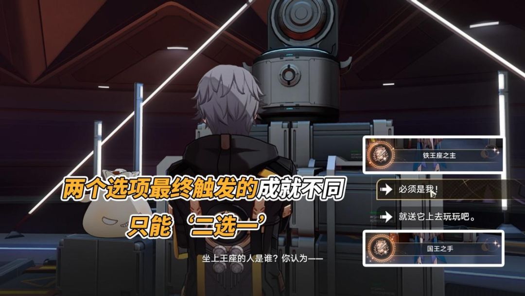 名为烧麦状的洞悉者会邀请你帮助它安置王座,当一切就绪后,有两个选项给你:①自己坐上去(消耗1个‘崇高道德的赞许’并触发成就「铁王座之主」)、②让它坐上去玩玩(触发成就「国王之手」并获得1个‘崇高道德的赞许’)。这两个成就只能二选一,看你喜欢哪个了~