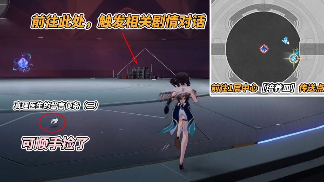 前往1层中心【培养皿】传送点,前方不远处可见一堆由箱子堆叠的奇怪‘建筑’,靠近后触发相关剧情。按理说途中会遇到一张‘真理医生的留言便条(二)’可顺手捡起,缩减后续相关成就触发所需步骤。