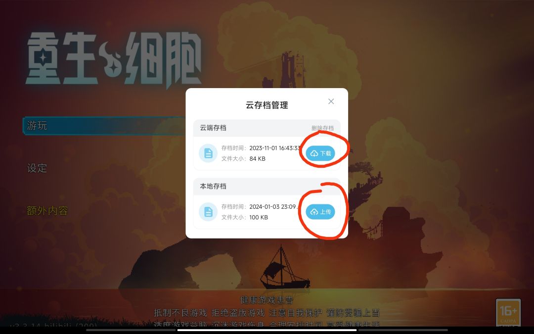 进入游戏,点击游玩,下面有一个存档,左上角有一个云存档,把自己现在的存档上传,然后卸载游戏,重新下载,打开以后,下载你刚刚上传的云存档,这个bug是游戏特色,都会遇到的,就看下面图片,用红线圈起来的部分
