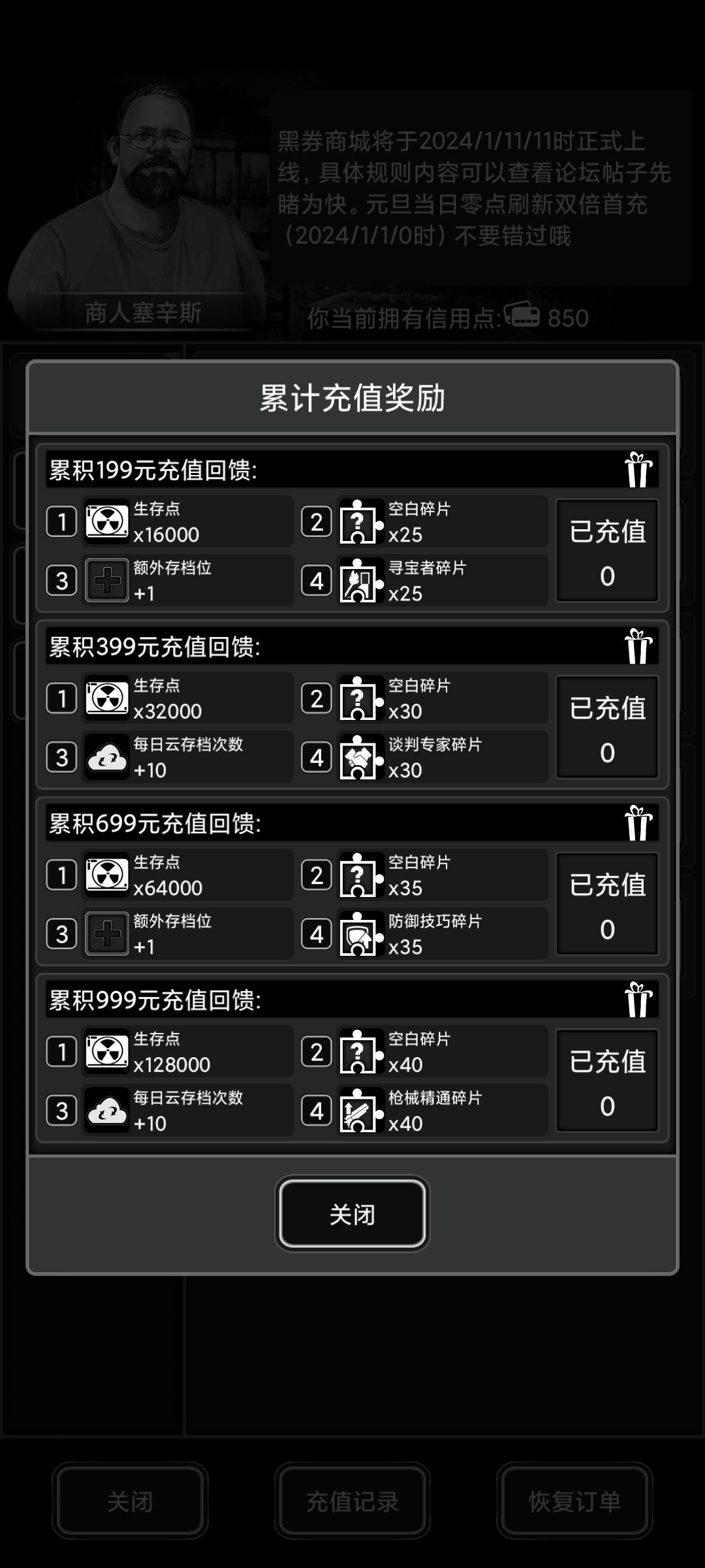 推荐充到399就够了,毕竟每天都能领取到330信用点,这款游戏的福利也很多。再就是推荐一下这三款官方礼包,可以很好地帮你度过游戏前期(1-10天,这期间你可以积攒物资,在第9天换到更好的背包。食物和水也能通过种植和搜集得到补给。这把手枪好好维护,到后期还能升级,非常有用。)