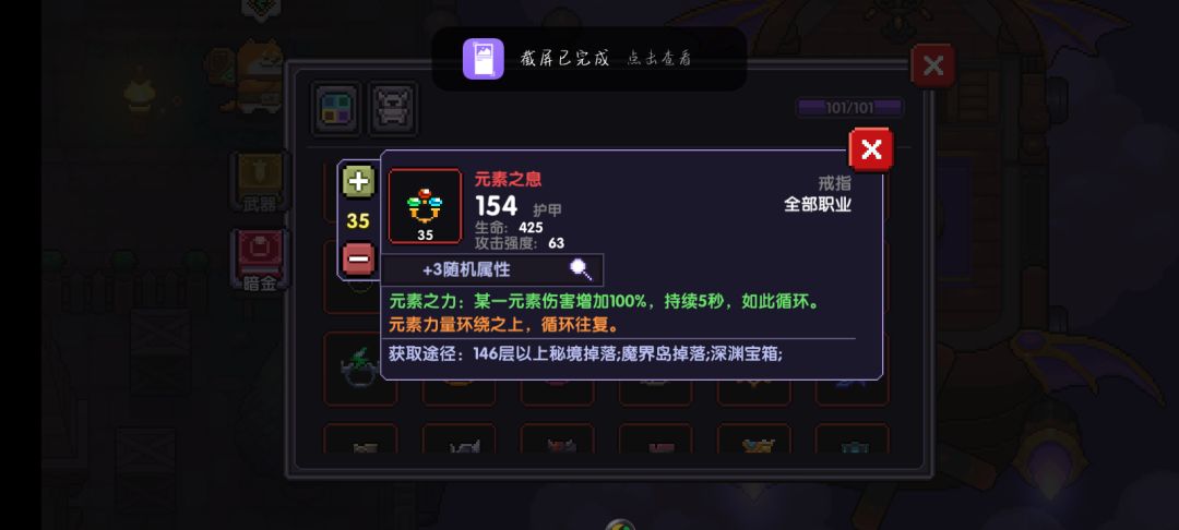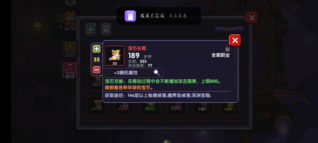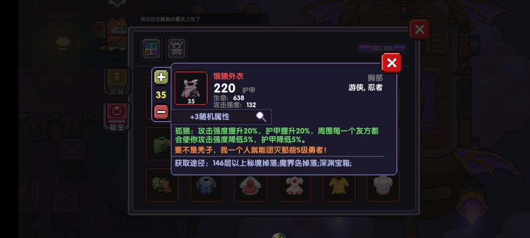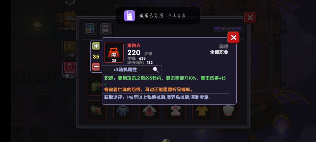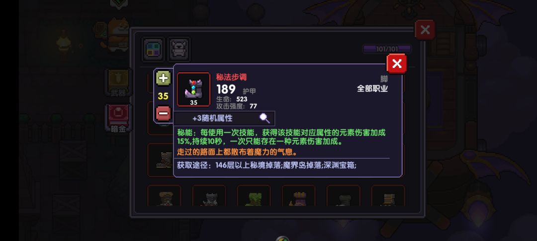 然后等开启魔界高以后,推荐直接打到25级装备章节,然后做一套25级装备,不用做20级的。PS:因为现在有了宠物,所以应该很好打过。