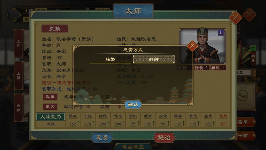 在公卿界面新增了“详情“入口,点击详情可进入公卿功能界面。在该临时界面中,我们可以对已有的公卿家族进行一系列操作。