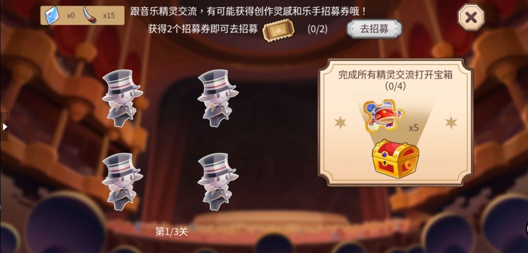 目标:获得招募券、灵感,寻找乐手。