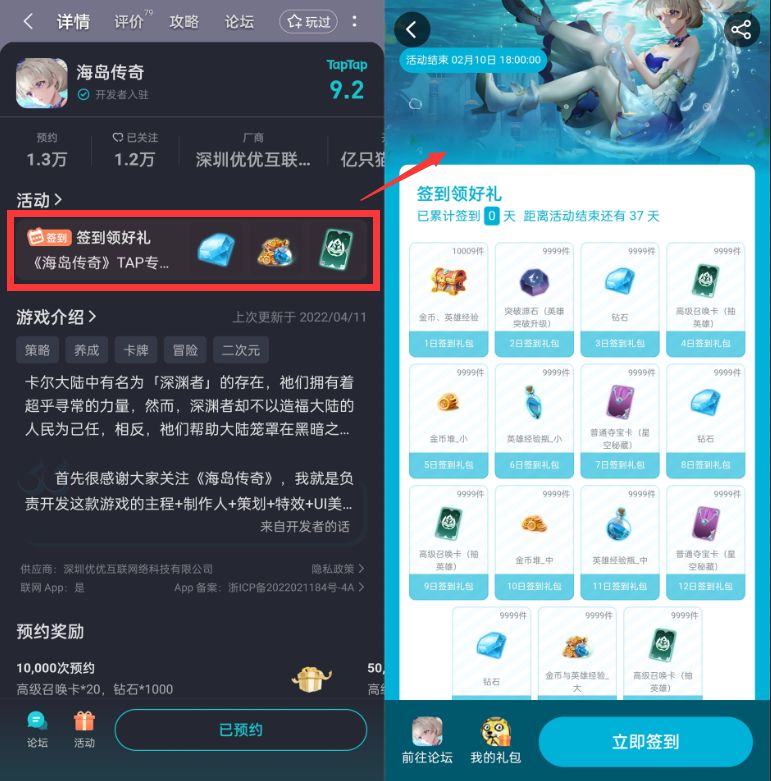 在我们的游戏详情页中就可以找到我们的签到礼包活动啦,累计15日签到领取丰厚奖励,大家记得打卡哦