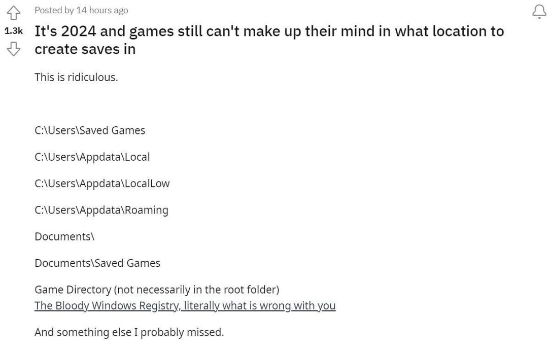 如果你曾在电脑上找过游戏存档文件,那你肯定知道大多数PC游戏将存档保存在不同的位置,而且没有统一的存档路径。这给许多玩家带来了麻烦,他们不得不费劲查找每个游戏存档的位置。最近有些人在Reddit论坛发帖称:现在都2024年了,为何PC游戏仍然没有统一的存档位置。
