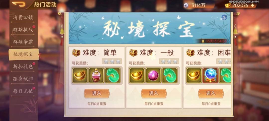 活动内容:活动期间进入探宝秘境,寻找隐藏在地图中的宝箱,打开宝箱可获得奖励。开宝箱时有概率触发boss,挑战成功可获得额外奖励。