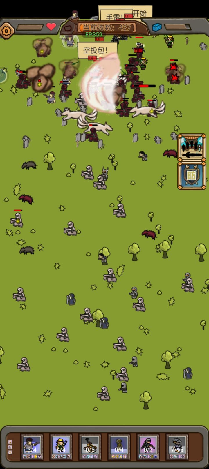 基本阵容:投石车+持枪幸存者+棍棒幸存者+现代士兵(特种兵),剩下两个随便带。
