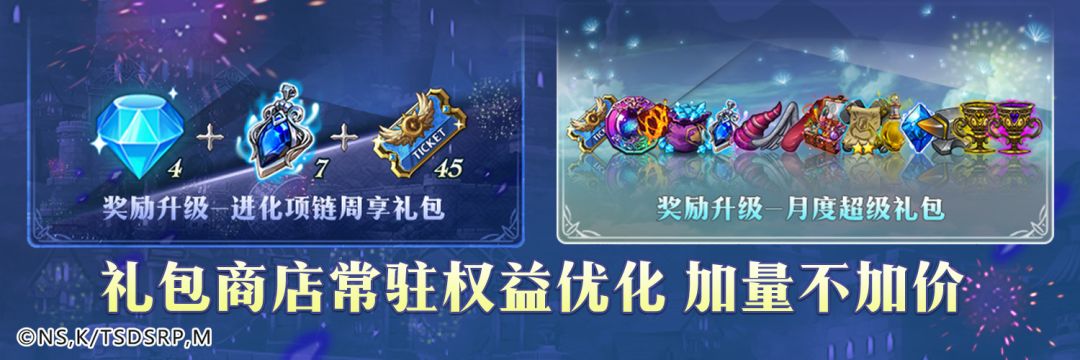 - 每日特殊福利内容:SSR进化项链*1、6星英雄强化药水*2、超觉醒币*3、贝尔莫斯的核心*5、关卡扫荡券*5