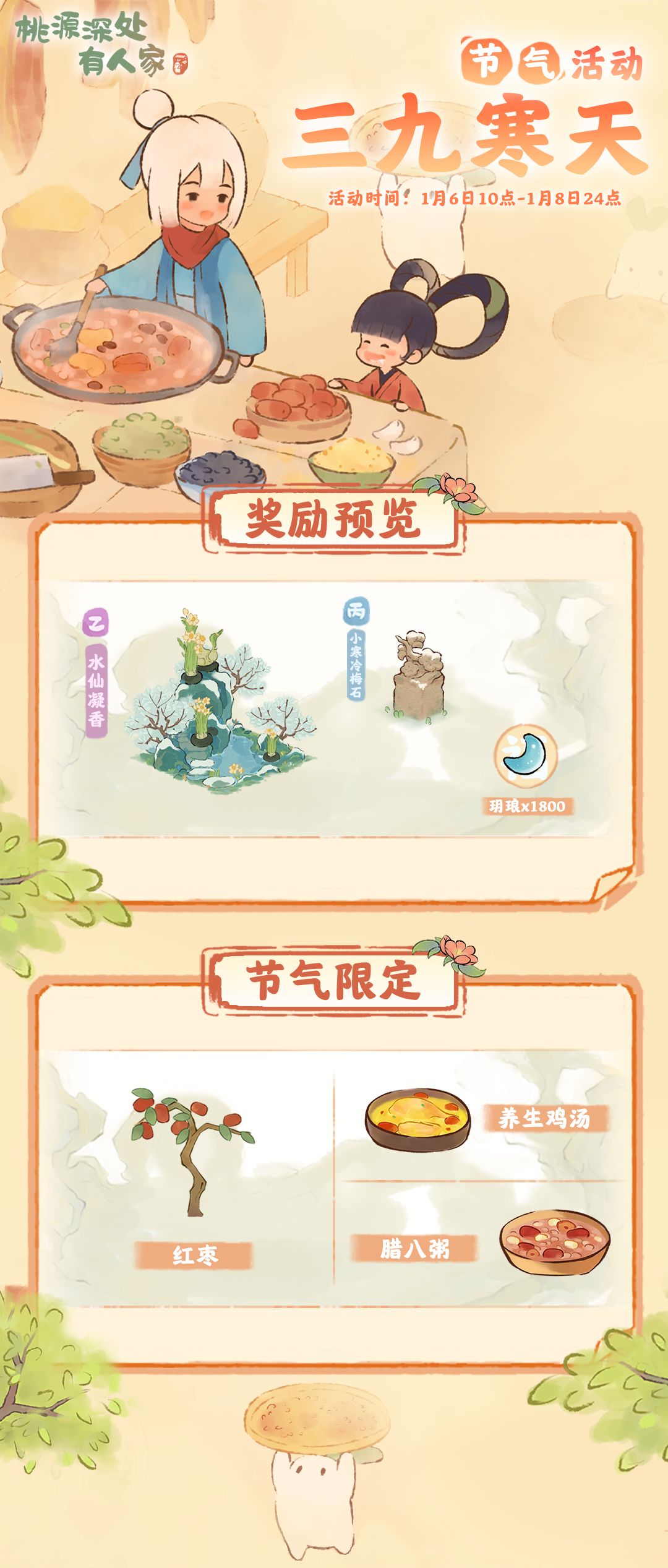 山民在活动期间内,可种植特殊农作物「红枣」和制作特殊节气菜品「养生鸡汤」「腊八粥」,提交节气订单可以额外获得玥琅。萝萝山已准备好了本期的节气限定建筑,山民记得参与活动获取玥琅,不要错过兑换时间萝!
