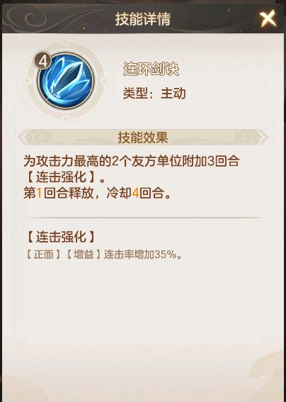 杨戬单靠自己,出手次数就多了很多,加上辅助兼次输出位置的裴旻之后,更加不得了。因为裴旻也有个恐怖的技能,叫做“连环剑诀”,它能给攻击力最高的2个友方单位增加3回合的“连击强化”。在《幻唐志:洪荒现世》中“连击强化”是什么意思呢?很简单,就是让你进行多次普攻。