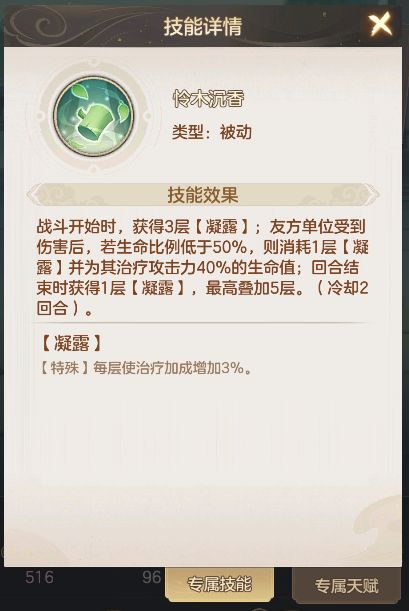比如,我们可以选择在前排放上涂山怜,她的技能除了治疗自己外,还兼具控制和肉盾的作用,一人分饰三角,非常可靠。另外奶妈可以选择建木仙,她的被动技能“怜木沉香”可以给队友增加3层“凝露”,友方单位受到伤害后,生命比例低于50%时,凝露可以为其治疗攻击力40%的生命值,是起死回生的重要技能。