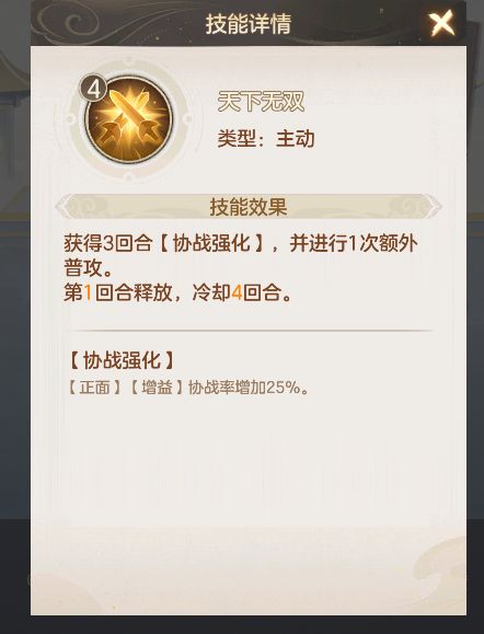 作为主输出位的杨戬,其自带的初始技能“天下无双”非常厉害,能获得3回合的“协战强化”并进行一次普攻。在《幻唐志:洪荒现世》中,“协战强化”是一个非常不错的正面增益buff,它可以让杨戬在3个回合中,有几率在队友攻击之后也跟着A一刀,累计起来,比其他人要多出手好多次,你说厉不厉害?