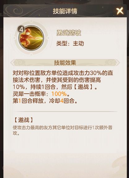 这个阵容第三个必要的角色是樊梨花,因为她的核心技能“勇武踏破”除了可以直接造成法术伤害外,还有“邀战”的效果。“邀战”,顾名思义,它在《幻唐志:洪荒现世》中的意思是在自己攻击完之后,邀请友方攻击力最高的角色进行一次额外普攻。这不,杨戬大哥又可以出手了。