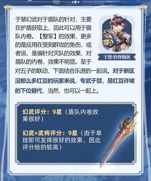 ②进攻向的增益,与乐进类似,集中在破盾的增益上,尤其是在现版本盾辅横行的环境下,破盾的难度,直接决定了于禁的效用体现。