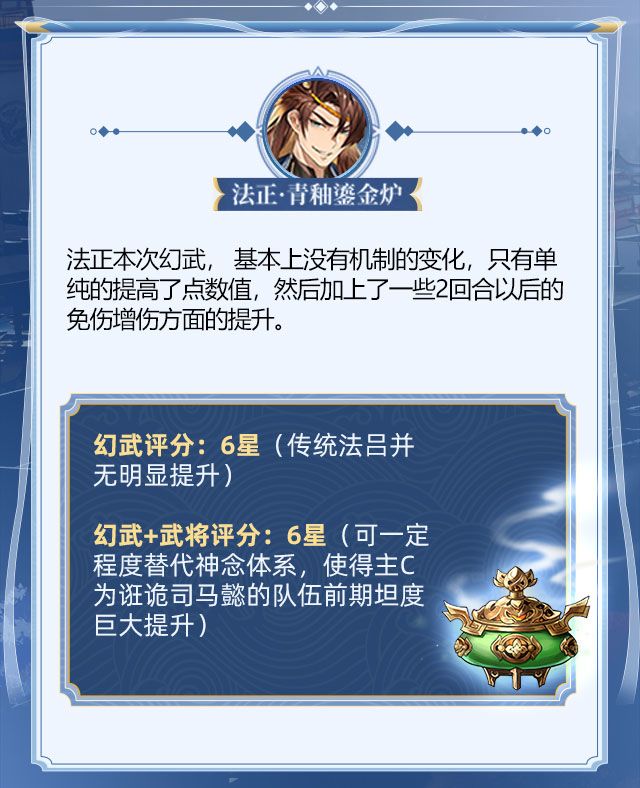 3、优劣势:单从数值上来说,法正的幻武调整,几乎可以用数值直接翻倍来形容。总体而言,目前幻武法正可以一定程度上融入诳诡司马懿体系中,加强首回合的坦度及偶数回合的爆发,但目前各类队伍首回合生存压力并不大,而后续的爆发亦不太依赖于传统的加成数值,导致法正由于没有机制上本质的变化,并不能带来pvp环境的重大改变,只能说“未来可期”吧。
