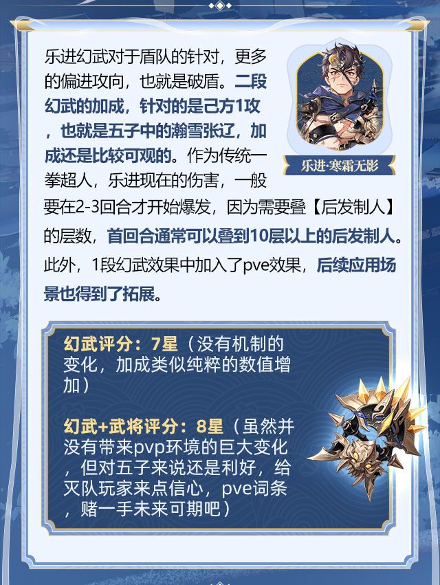 自身启动需要叠后发制人层数,也就是挨打反打的次数,而五子阵容中,对主C瀚雪张辽的加成,同样依赖于后发制人的层数,这意味着,乐进的幻武定位,其实更加适合一个中慢速启动反打的队伍,而不是五子这种,主动高频的进攻型灭队。