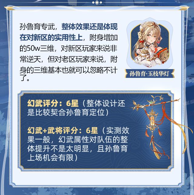 3、优劣势分析:幻武设计契合武将定位,但由于孙鲁育自身没有比较适配的pvp强势队伍,导致武将及专武的强度较低,毒伤体系有待开发。