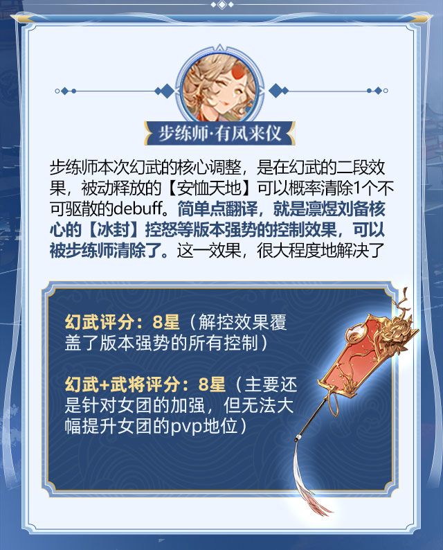 提升:本次的幻武调整,升级了步练师的驱散能力,并且将步练师的驱散效果设定为凌驾于现版本所有的控制效果之上,毫无疑问,这对于一个辅助卡来说,是非常优秀的机制。治疗方面的提升,在基础的攻击力60%-120%的基础上,增加了安恤天地50%概率增加一个抵挡下次伤害15%的幻象类护盾效果,对队伍坦度有一定提升,但不大,核心的增益还是在驱散能力上。