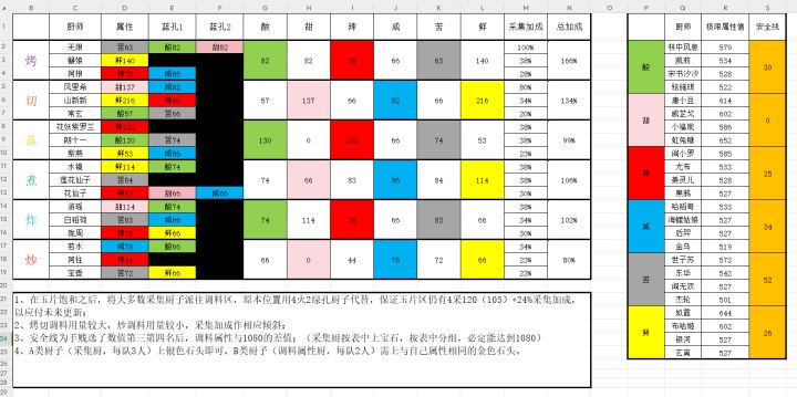 1080/3=360,所以新版本调料系统可以这样玩,一号位二号位使用采集厨(春丽这种,无绿孔的优先),位置固定且永远不再换,一辈子留在这个点就业。3,4,5号位置随便抓3个属性值超过360的相同调料属性的厨子。由于新系统的出现,在不升级心法盘的情况下,仅穿戴50属性的石头,就有很多厨子可以做到360属性值。酸甜苦辣咸鲜每种弄六个360属性的厨子,这样在没有采集编队的情况下,游戏体验会好很多。