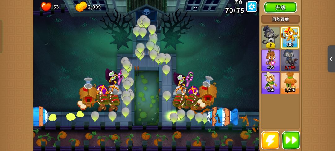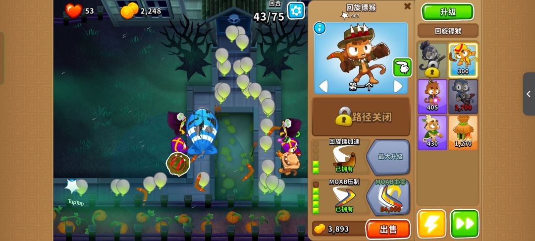 打了两遍确认无误,阵容看图,首先建议开慢速,前期丢血不要怕,然后需要点关于飞镖猴的知识如上图,没有点不建议打,两边是对称的。开始放两飞镖猴,全升2-0-2如上图,放一个法师猴在右边,升0-0-2防迷彩,记得点瞄准迷彩,飞镖猴全升3-0-2,放第二个法师猴,升2-0-2,先给一边升2-0-4,再升另一边如上图,先给左边放第三个飞镖猴升0-2-4(重点),再放第四个如上图。后面就可以随意点了,我是先升一个飞镖猴到4-0-2,再放第五六个飞镖猴升0-2-4,然后升第二个到4-0-2就放第七八个飞镖猴升3-0-2如上图,放两个猴子村先升0-2-0,再升3-2-0如上图,放四个德鲁伊升0-1-3通关如上图。