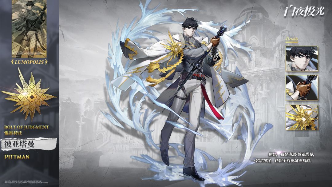 白夜城审判庭审判官,性格古板、务实、雷厉风行,现在正为了查明过去的案件而四处奔走。